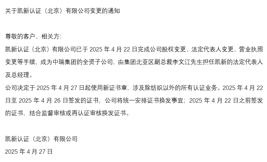 尊敬的客戶、相關方: 凱新認證(北京)有限公司已于2025年4月22日完成公司股權變更、法定代表人變更、營業執照變更等手續,成為中瑞集團的全資子公司,由集團北亞區副總裁李文江先生擔任凱新的法定代表人及總經理。